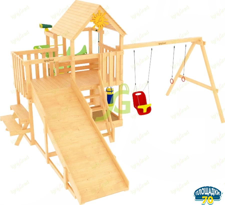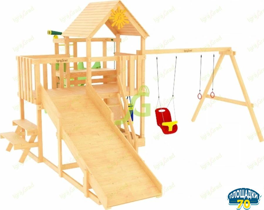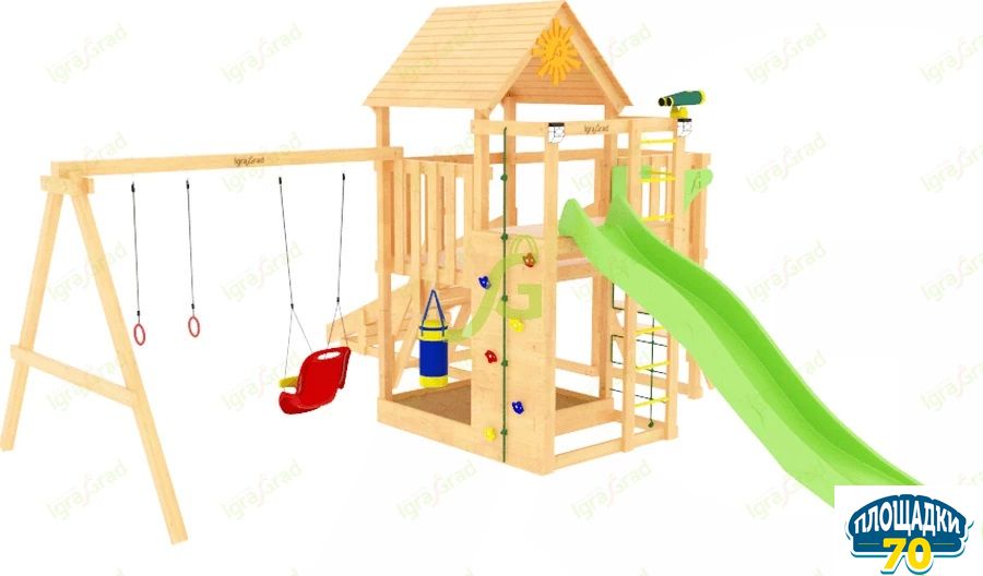 Деревянная несущая конструкцияпредставлена в виде двухуровневой башни с крышей, совмещенной с зимней деревянной горкой. Её дополнением является качельный модуль с пластиковой кубельковой качелью для маленьких детишек и круглой качелью с сеткой для детей постарше. Лесенка, волновая горка находятся на удобной безопасной высоте.
