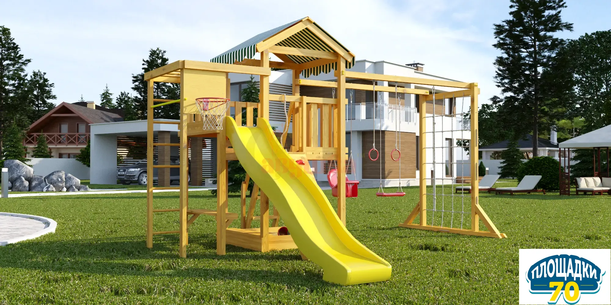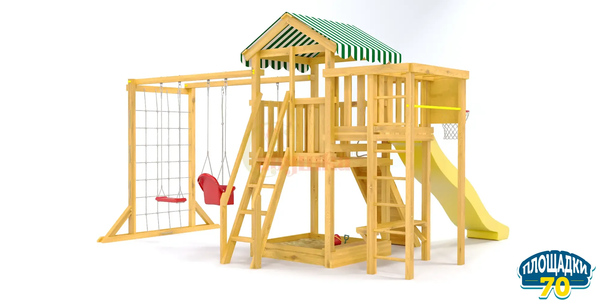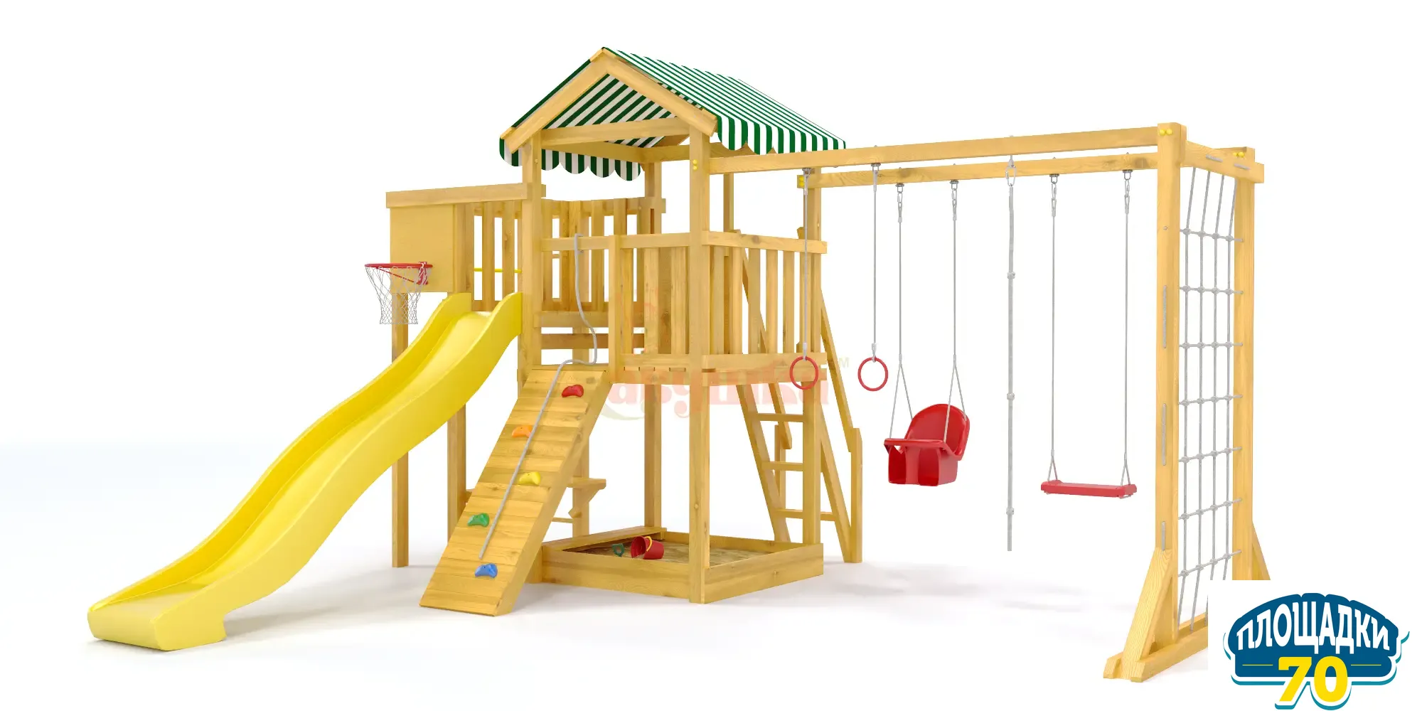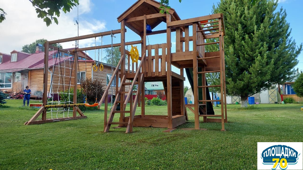 В основе натуральный материал – клееный брус 75х75 мм, который не меняет геометрию со временем, не скрипит и не рассыхается. Он отшлифован, углы скруглены, чтобы не получить занозы и ссадины. Конструкция и элементы качельных подвесов разработаны и произведены согласно ГОСТ. Дерево экологичное, прошло сертификацию, поставляется без покрытия и технологических отверстий.Особенности модели