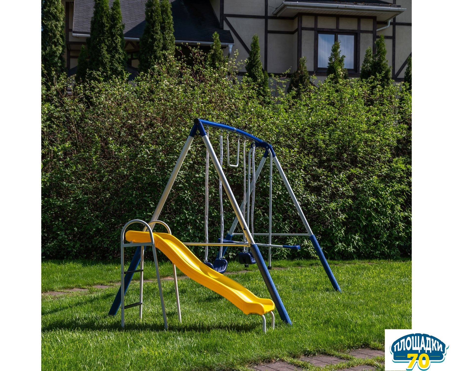 Качели и горка изготовлены из пластмассы, устойчивой к воздействию солнечных лучей.
