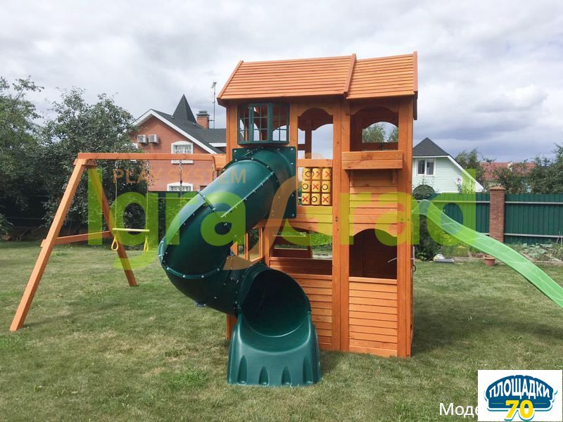 Детская площадка для дачи выполнена в виде домиков для игр, благодаря этому дети больше времени будут проводить на улице вдыхая свежий воздух. Такая игровая конструкция изготовлена по всем требованиям детской безопасности.
