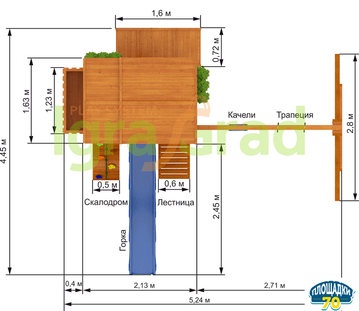 Основной материалСосна/ельОснованиеЩитовая конструкцияВысота3.4 мШирина4.45 мДлина5.24 мКоличество горок1Тип скатаСкат с высоты 1,5 метраТип площадкиГотовый комплект с отверстиями и фурнитуройВысота установки ската1.5 мДлина ската3 мДлина качельной балки2.80 мДеревянные перила в комплектеДаОсобенности серииЭксклюзивная закрытая конструкция домика, яркие декоративные элементы, возможностьВес464 кгТип окраскиПропиткаИнструкция по сборкеДаТип упаковкиКартонная упаковкаТип шлифовки2-х этапнаяНаличие присадки (отверстий для сборки)ДаЦветСоснаЕдиница измеренияшт -