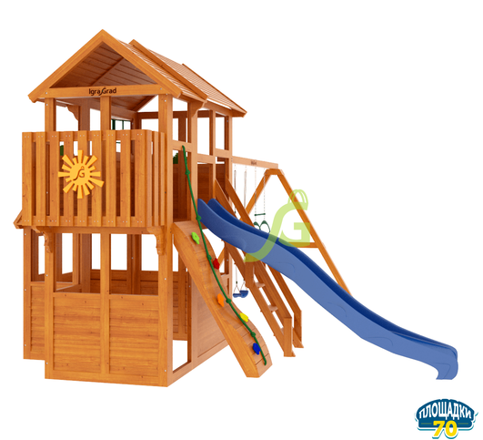 Детская площадка на даче или во дворе – самое оптимальное решение. «Клубный домик 3» представленный компанией IgraGrad – это современное эргономичное игровое оборудование для активного времяпровождения детей на свежем воздухе. В комплекс площадки входят двухуровневый домик с трехметровой волновой горкой, деревянная лестница, скалодром, качели, доска для игры в "Крестики-нолики".