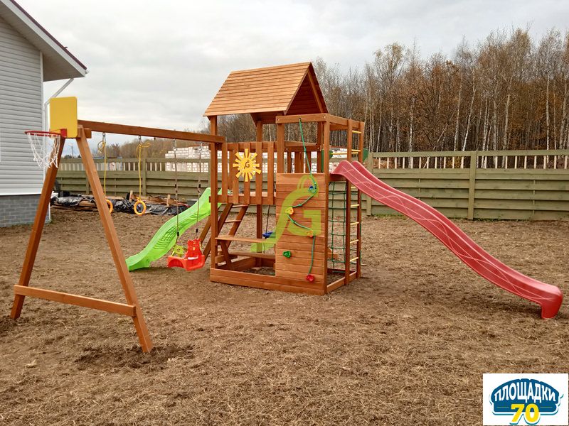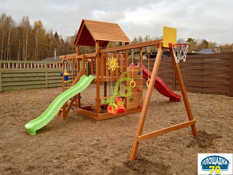 Сооружение представляет собой двухуровневый домик с крышей, вокруг которого расположено дополнительное оборудование для активных игр. Основание домика – идеальное место для установки песочницы, здесь же предусмотрено наличие столика со скамейкой для отдыха. Горка – самый популярный предмет детского пользования, поэтому детская площадка оборудована сразу двумя скатами с бортиками.