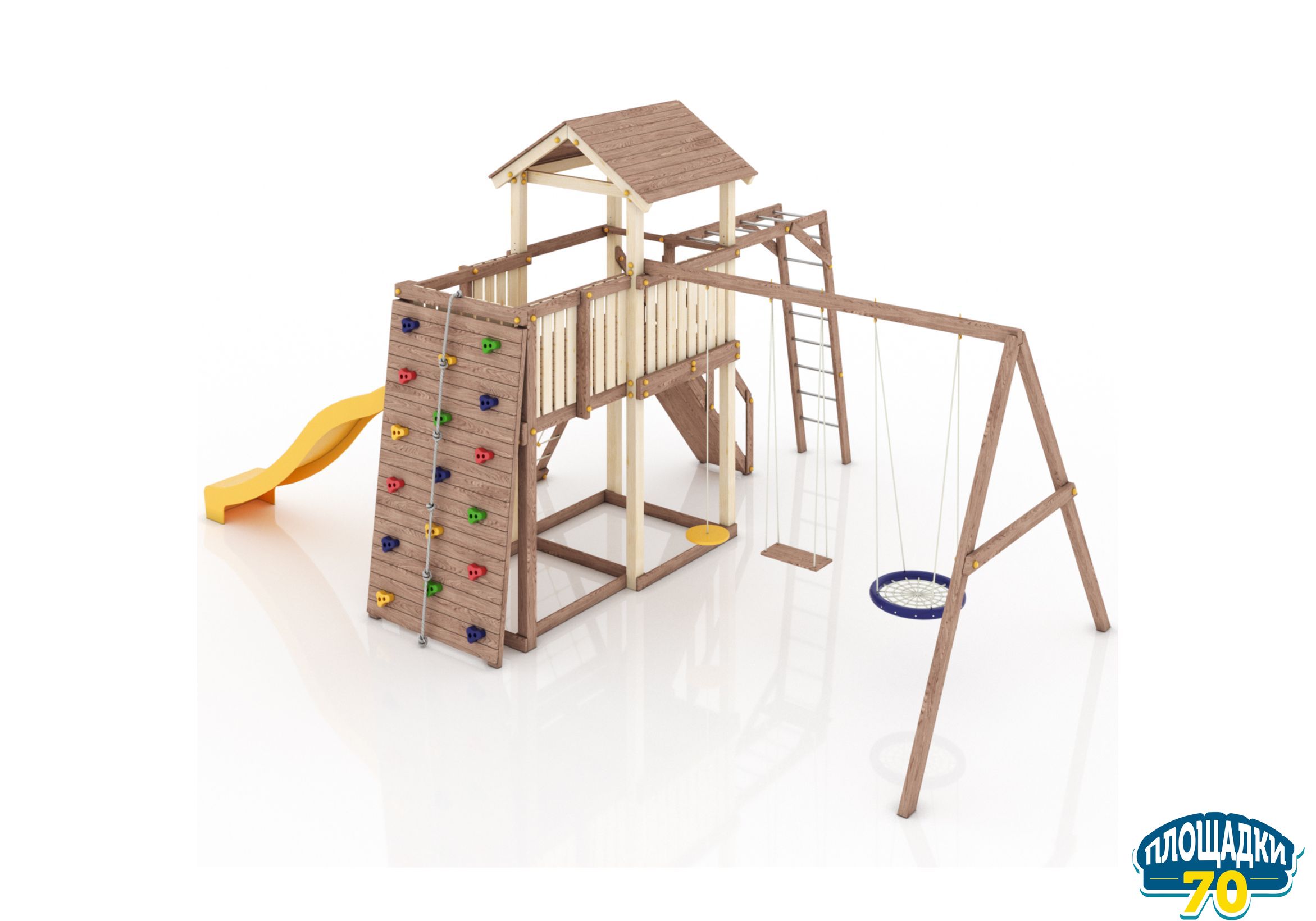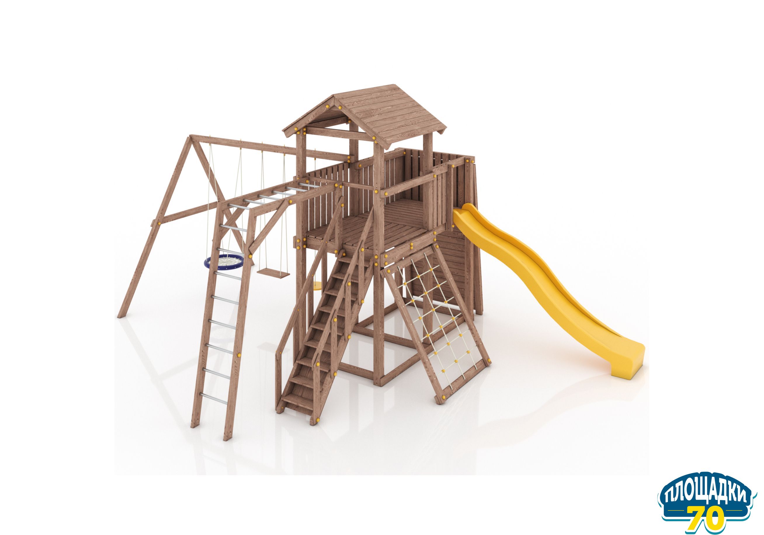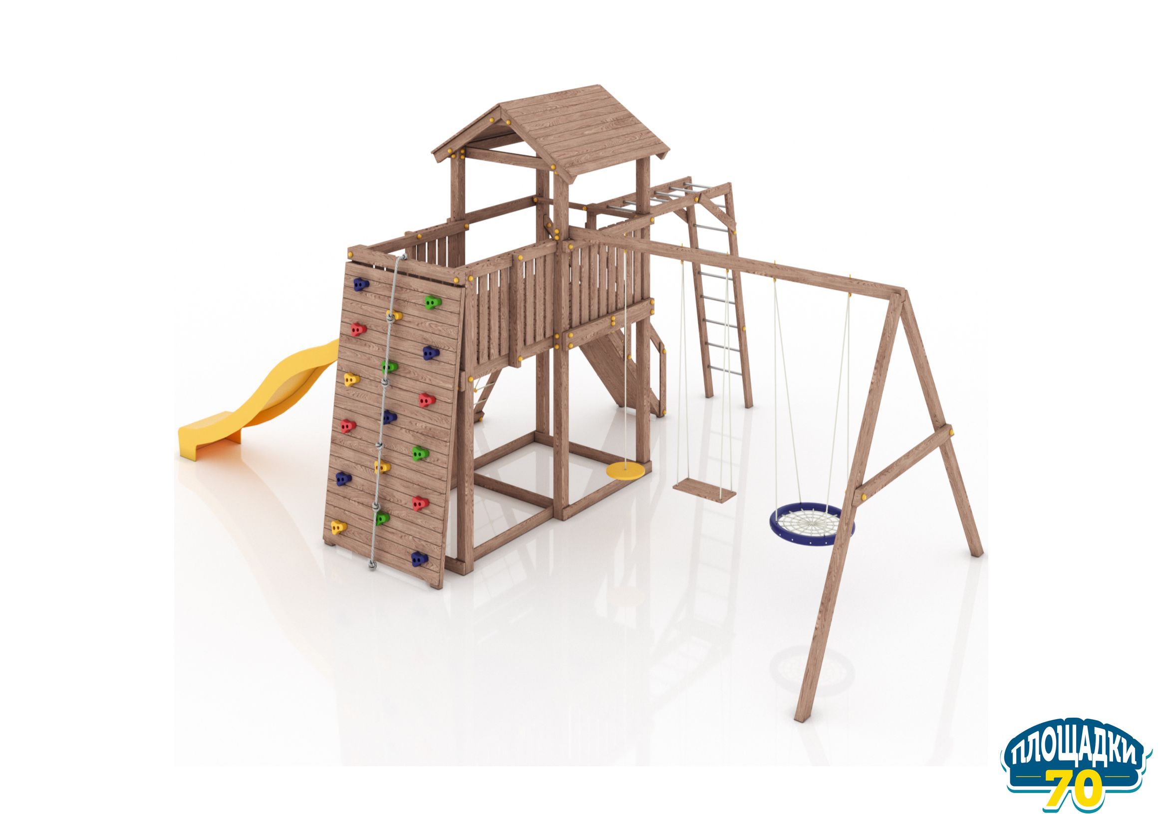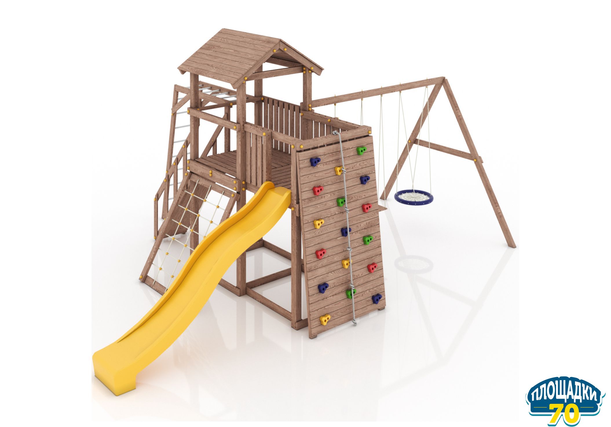 Максимально возможная комплектация в сочетании с качелями-гнездом. Детская площадка в полной комплектации позволит вашим детям разнообразить свои игры на свежем воздухе, а так же пригласить своих друзей для веселого времяпрепровождения. Места хватит всем!