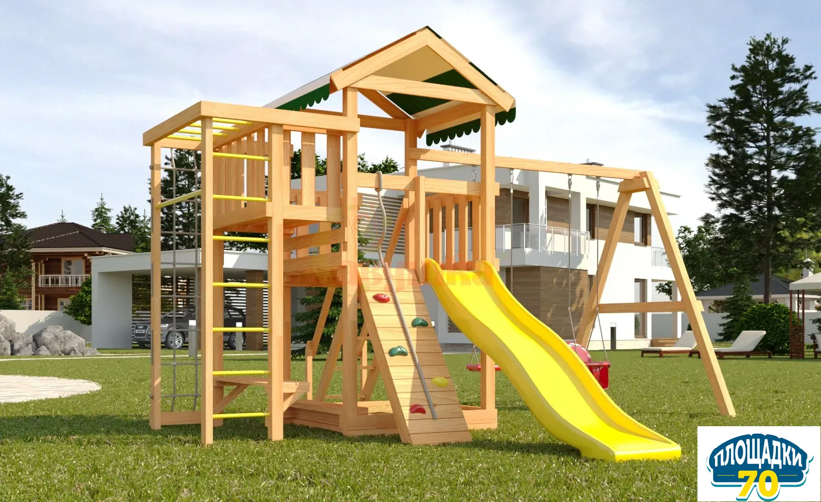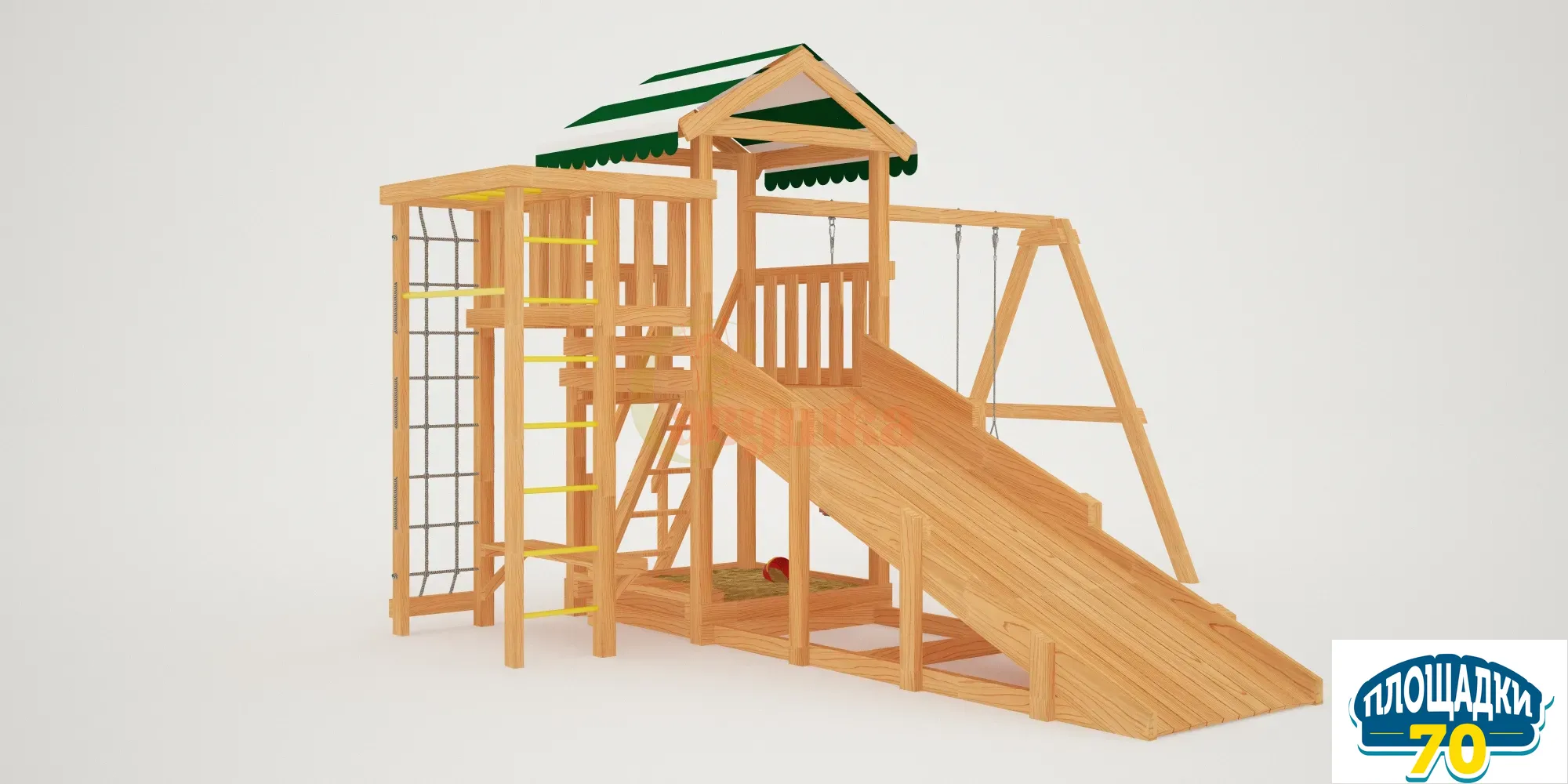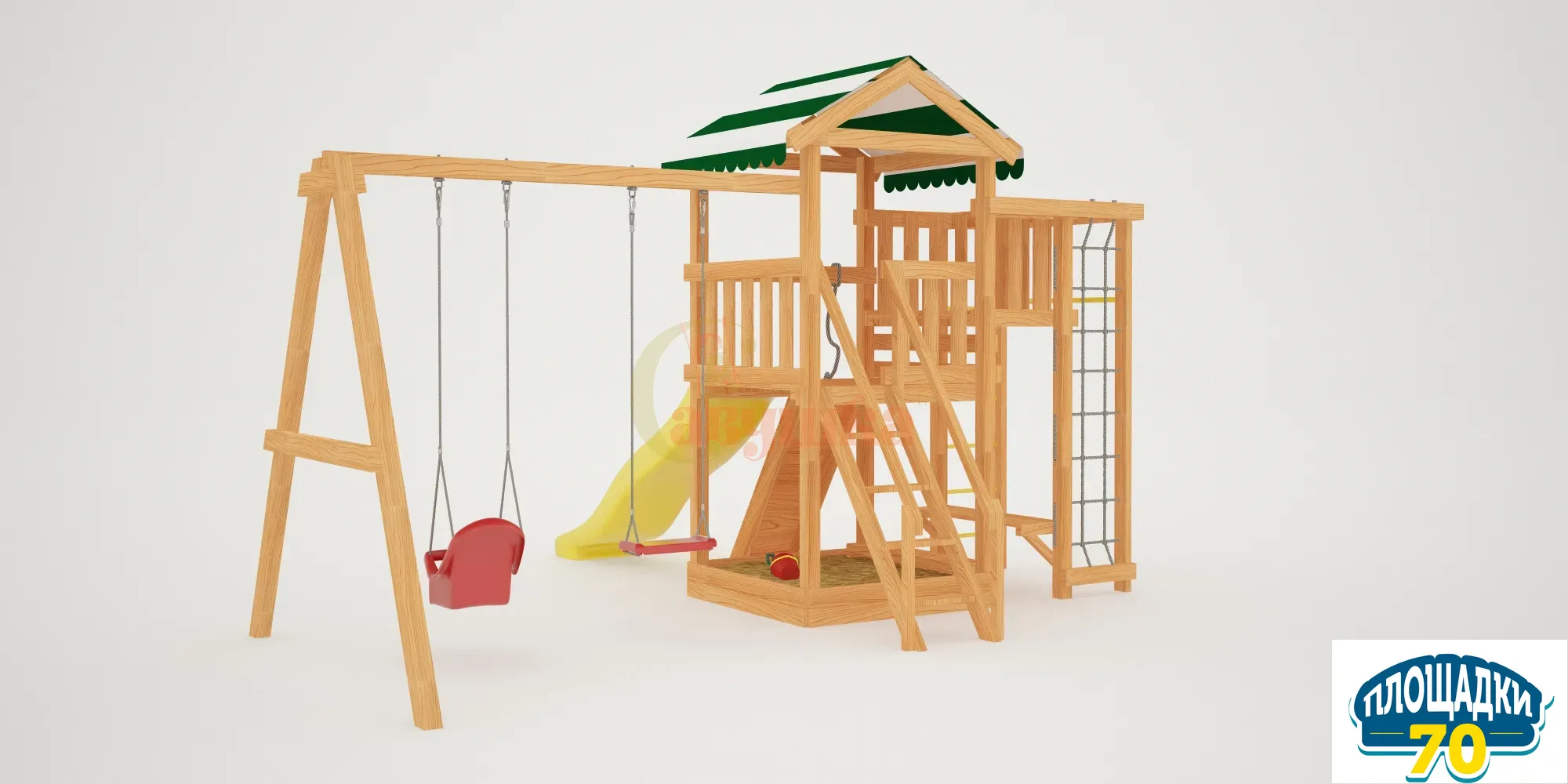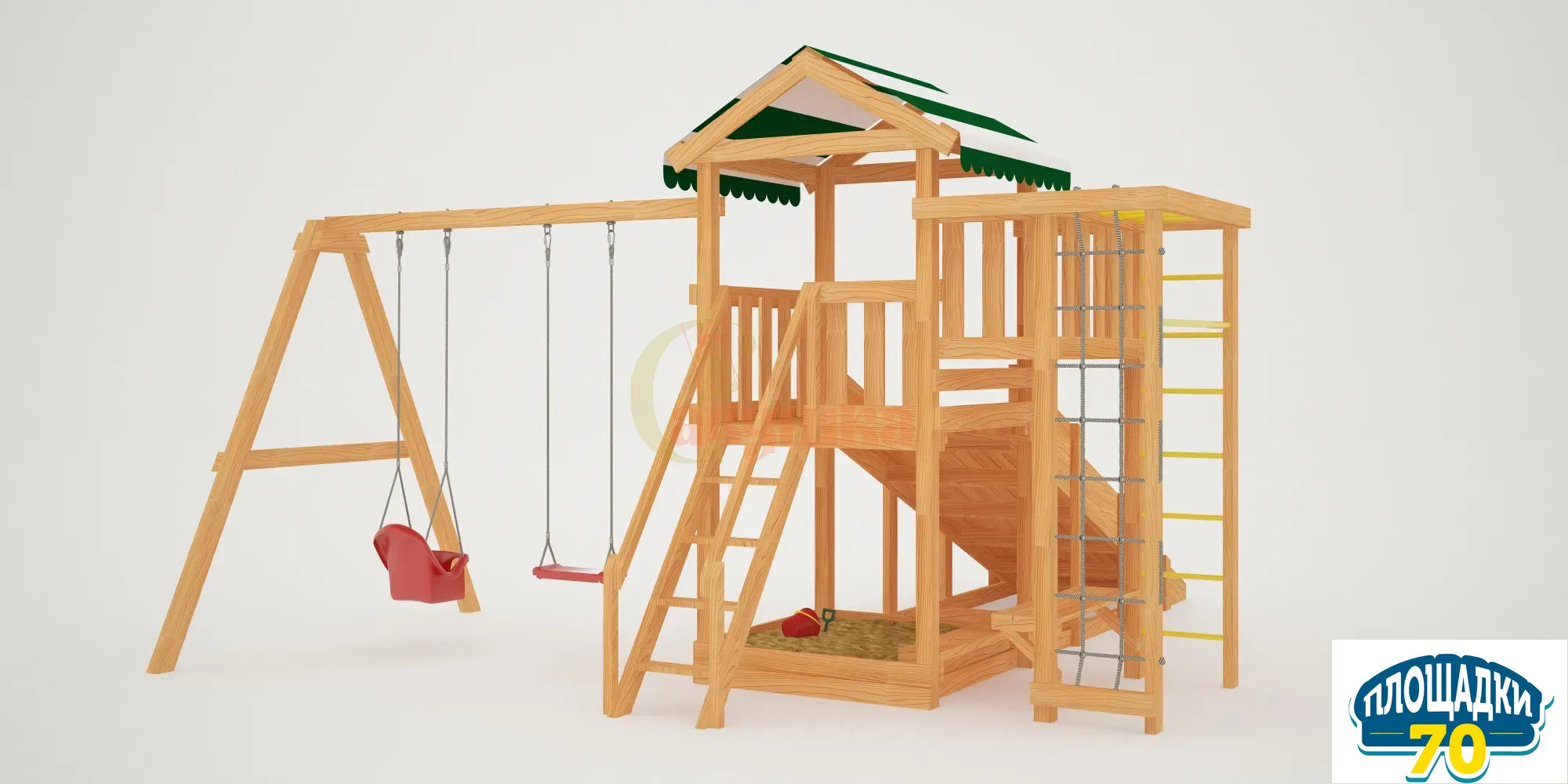 В центре площадки находится игровая башня, внизу малыши найдут песочницу с лавочкой. Подняться на башню можно по деревянной лесенке или по скалодрому, оснащенному выступами для ножек и канатом. На башне есть балкончик, с которого открывается красивый вид на ваш участок.