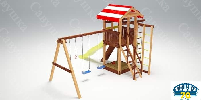К игральным элементам модели также относятся песочница с лавочками и две пары качелей. Качаться вдвоем всегда веселее – современные дети точно оценят это преимущество.