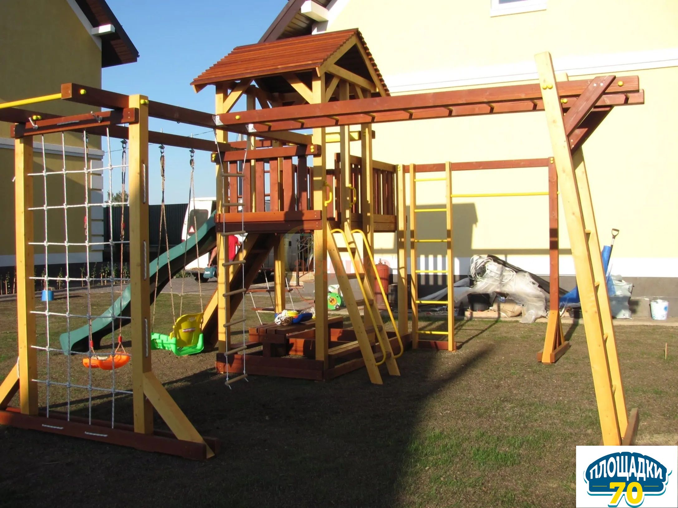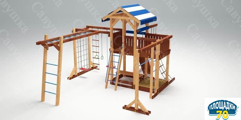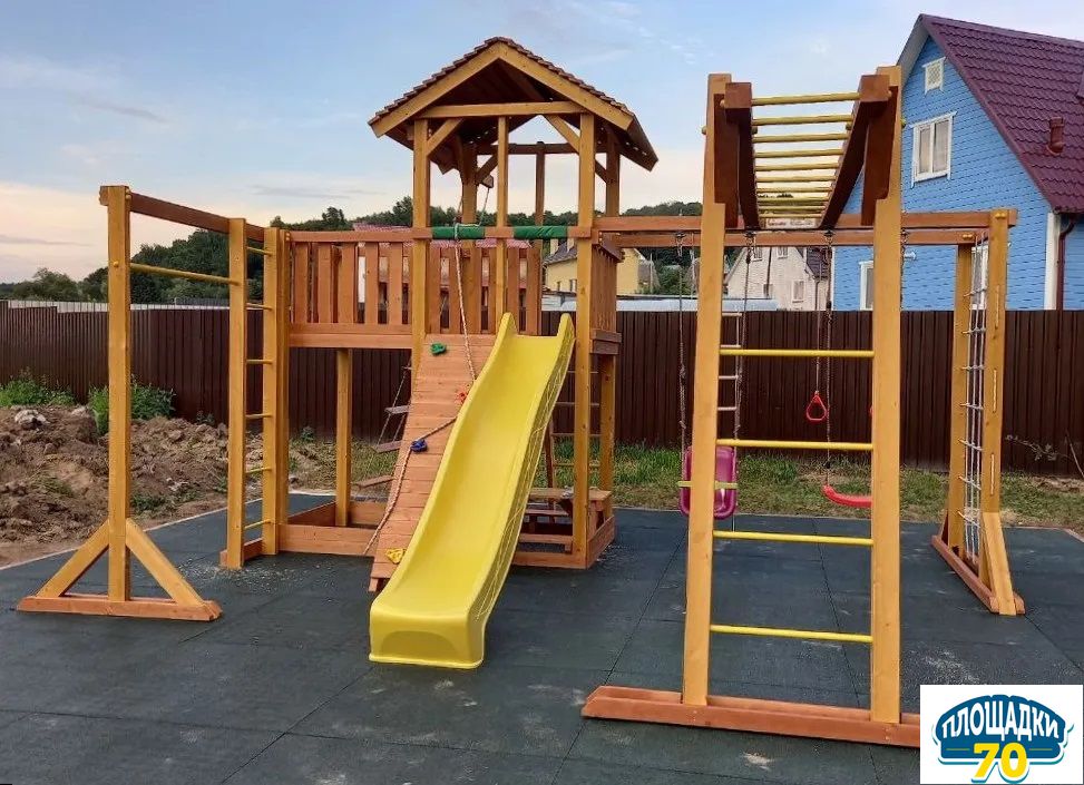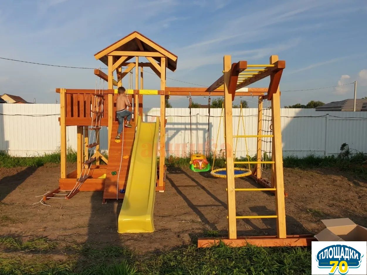 Каркас уличного комплекса отвечает требованиям ГОСТ, не меняет геометрию. Чтобы защитить деревянную раму от дождя или снега мы покрываем ее краской на водной основе. Она безопасна для малышей (имеет сертификат).