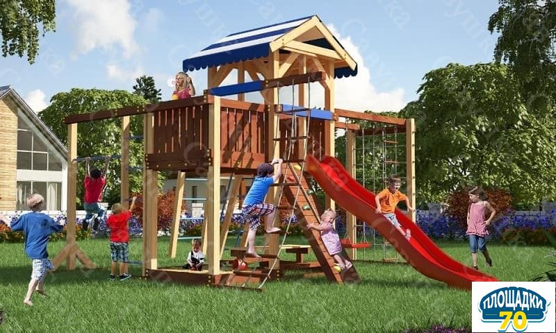 Малышей обрадует наличие полноценной пластиковой горки. Материал, из которого она сделана, может иметь красный, желтый, синий либо яркий зеленый цвет. Попасть на башню или балкон можно двумя путями - по лестнице или карабкаясь вверх по скалодрому с канатом. Второй вариант сложнее, но и интереснее.