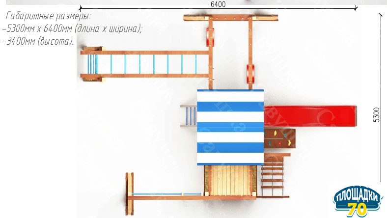 Длина5300 ммШирина6400 ммВысота3400 ммВсе детали шлифованыДаКачество древесины согласно ГОСТ9885-95.2Конструкция разработана и произведена согласно ГОСТ52169-2012Обработка дереваЛакокрасочным покрытием Sherwin-Williams (Шервин-Вильямс) с разрешающим сертификатомСиловые деталиКлееный брус 90х90мм.Элементы подвеса согласно ГОСТДаГарантия1 годЕдиница измеренияшт -