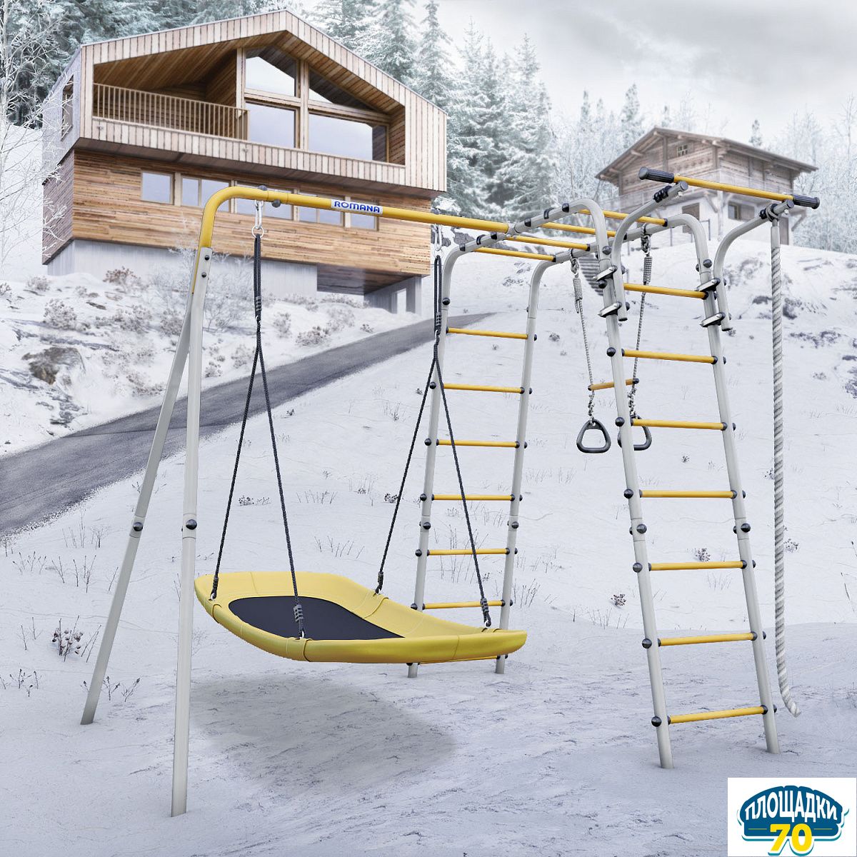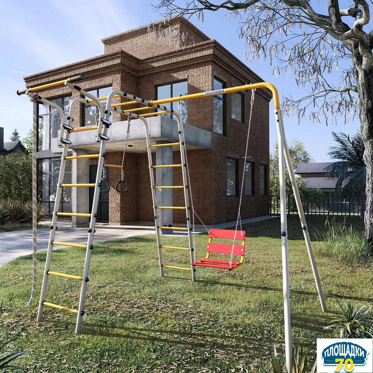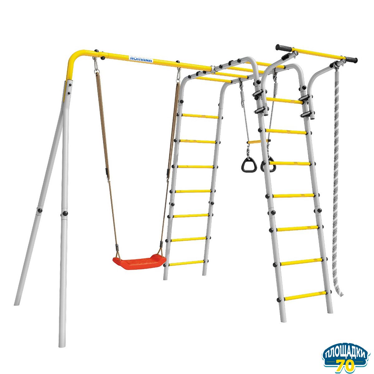 Множество спортивных объектов разнообразят активный досуг на свежем воздухе. В комплект включены следующие игровые элементы: канат, гимнастическая лестница, кольца с перекладиной, рукоход, подвижный турник. Подвижная конструкция турника позволяет установить его на удобной для ребенка высоте . Дополнить комплекс можно сеткой лазом, баскетбольным щитом и качелями разных видов. Множество игровых элементов способствует всестороннему физическому и интеллектуальному развитию ребенка.