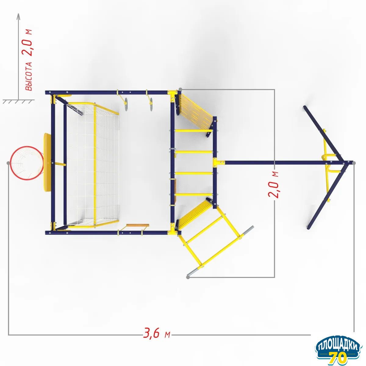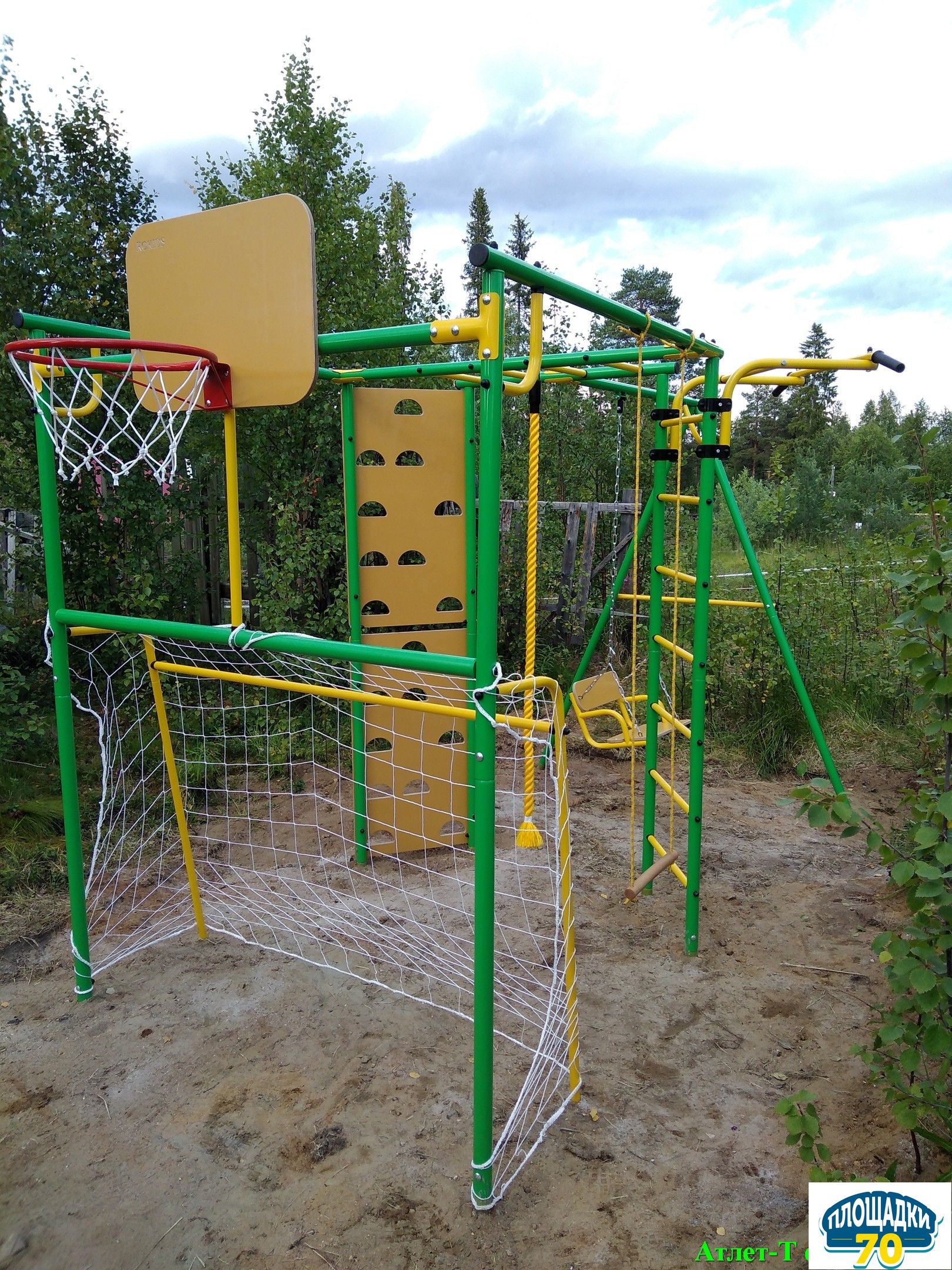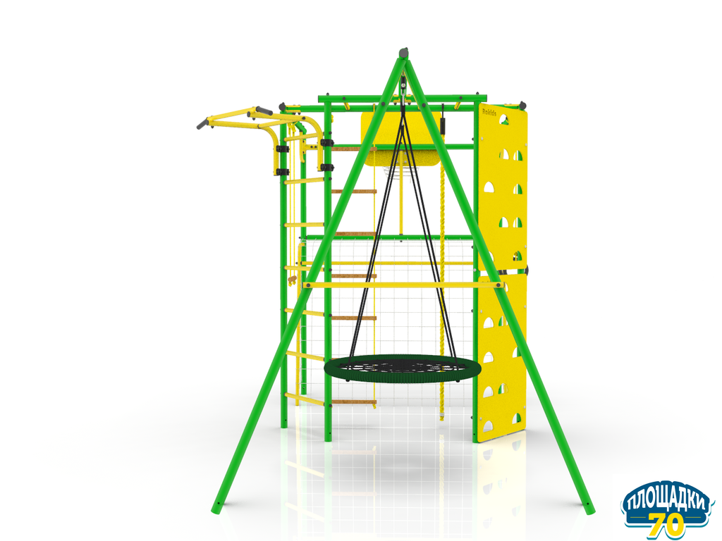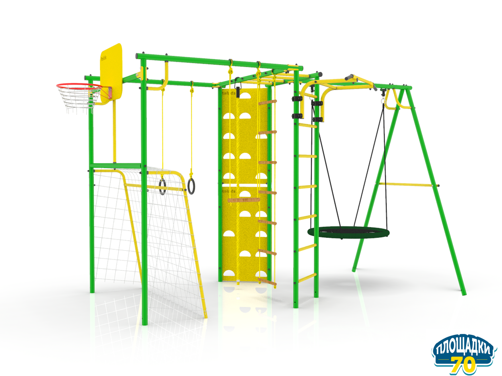 В комплектацию входит: ворота, скалодром, кольца гимнастические, канат, кольцо баскетбольное, лестница веревочная, турник, регулируемый по высоте, рукоход, подшипниковые опоры для качели, качели-гнездо 60 см, ступени ПВХ.