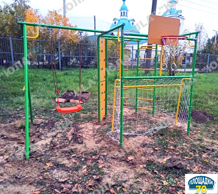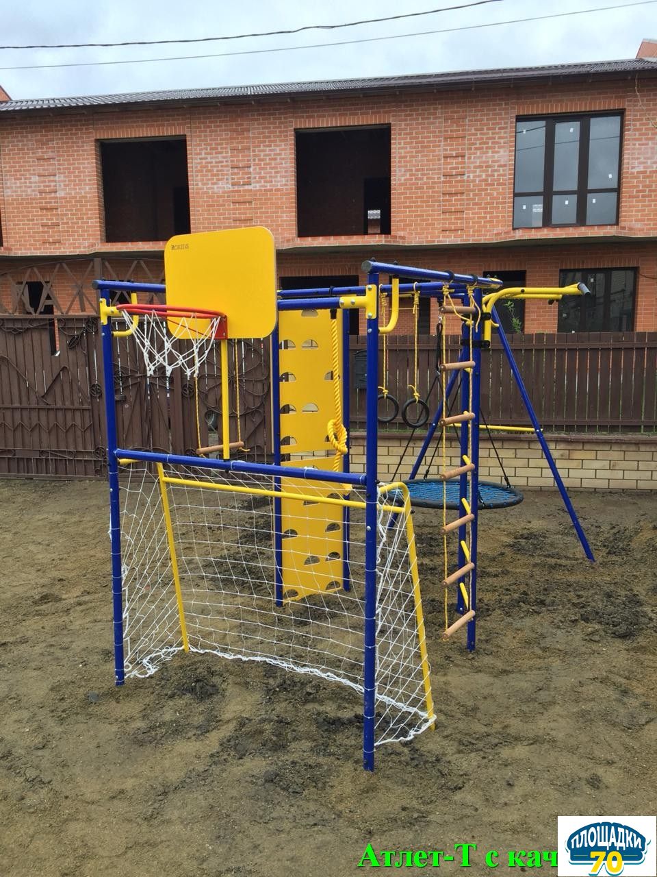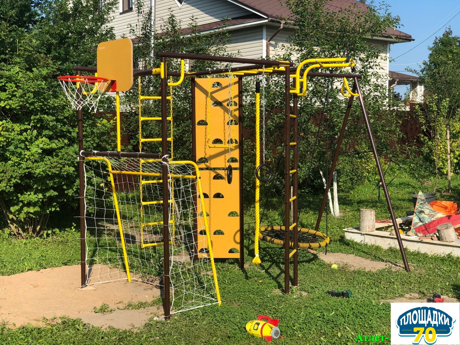 В комплектацию входит: ворота, скалодром, кольца гимнастические, канат, кольцо баскетбольное, лестница веревочная, турник, регулируемый по высоте, рукоход, подшипниковые опоры для качели, качели-гнездо 60 см, ступени ПВХ.