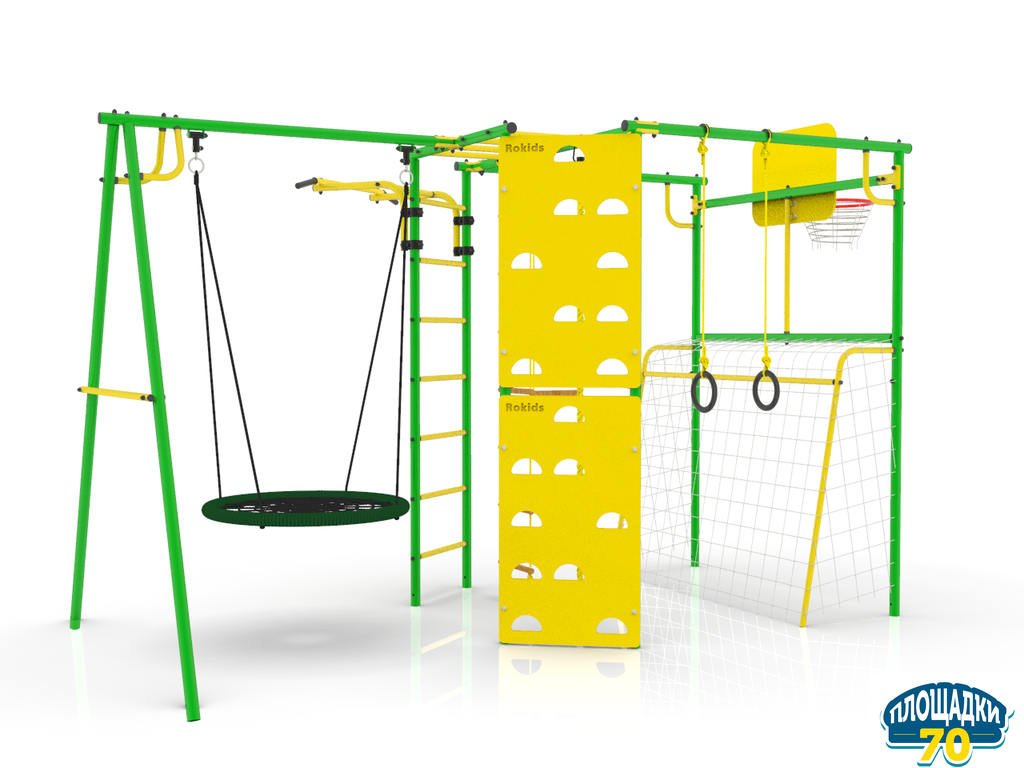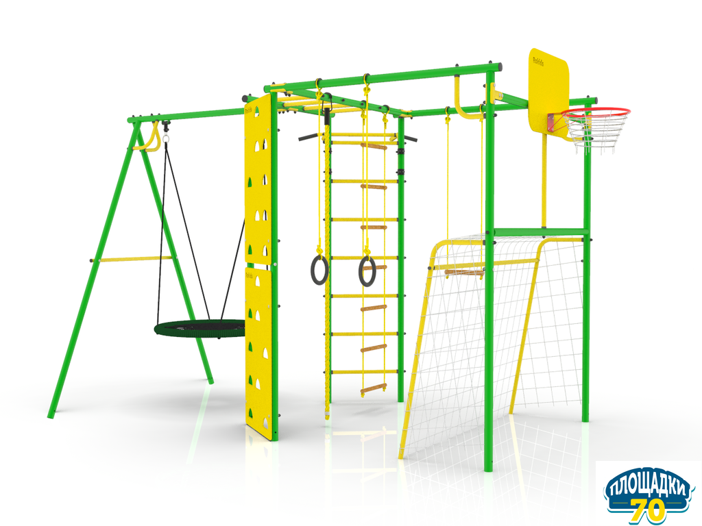 - Комплектация Ворота, скалодром, кольца гимнастические, канат, кольцо баскетбольное, лестница веревочная, турник, регулируемый по высоте, рукоход, подшипниковые опоры для качели, качели-гнездо 60 см, ступени ПВХ
